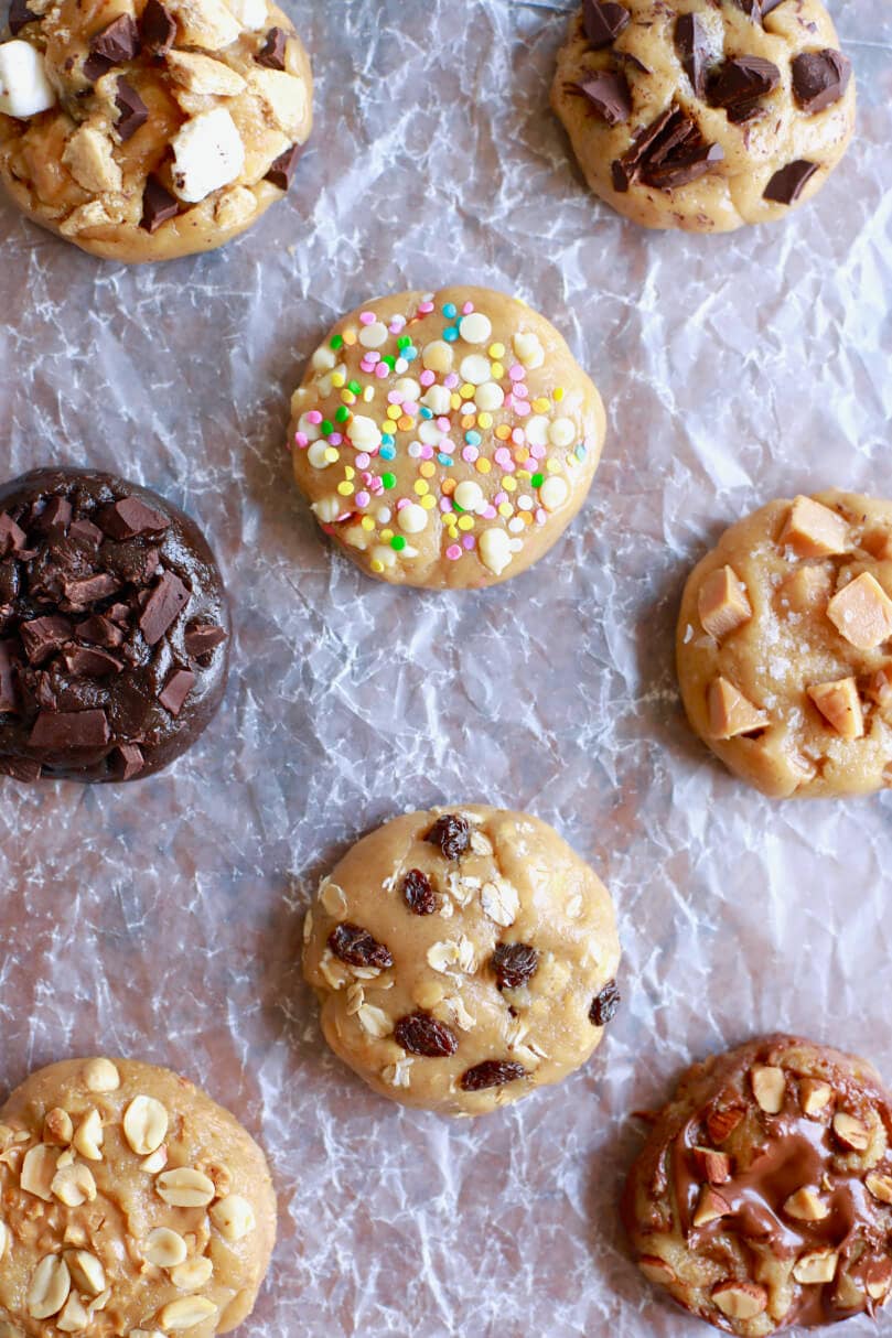• Chocolate Chip Cookie: Press your chocolate chunks into your base cookie and fold the cookie dough over itself to make sure the chocolate chunks are distributed throughout